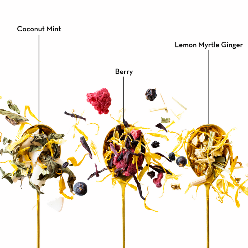 Coconut Mint, Berry Tea, Lemon Myrtle Ginger: